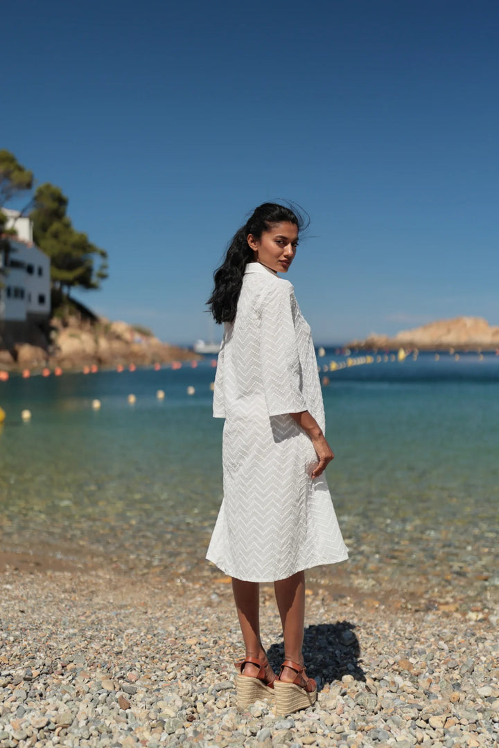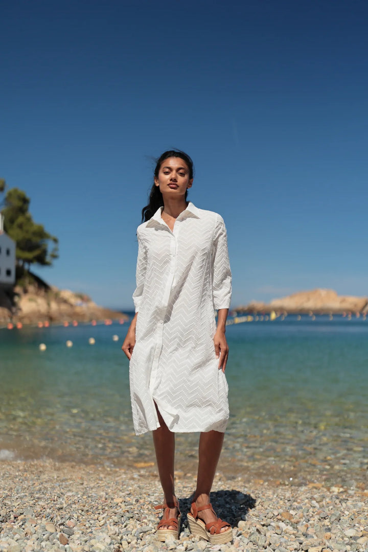 Abito chemisier. In elegante bianco con ricami in rilievo coordinati. Il materiale fluido offre una texture delicata e fresca per le giornate più calde. Il design presenta una silhouette rilassata con colletto a camicia. Maniche a 3/4. L'apertura frontale con bottoni lo rende versatile e facile da indossare. Questo capo è una scelta affascinante per godersi l'estate con stile e comfort. È ideale per un look casual-chic che unisce leggerezza e stile.