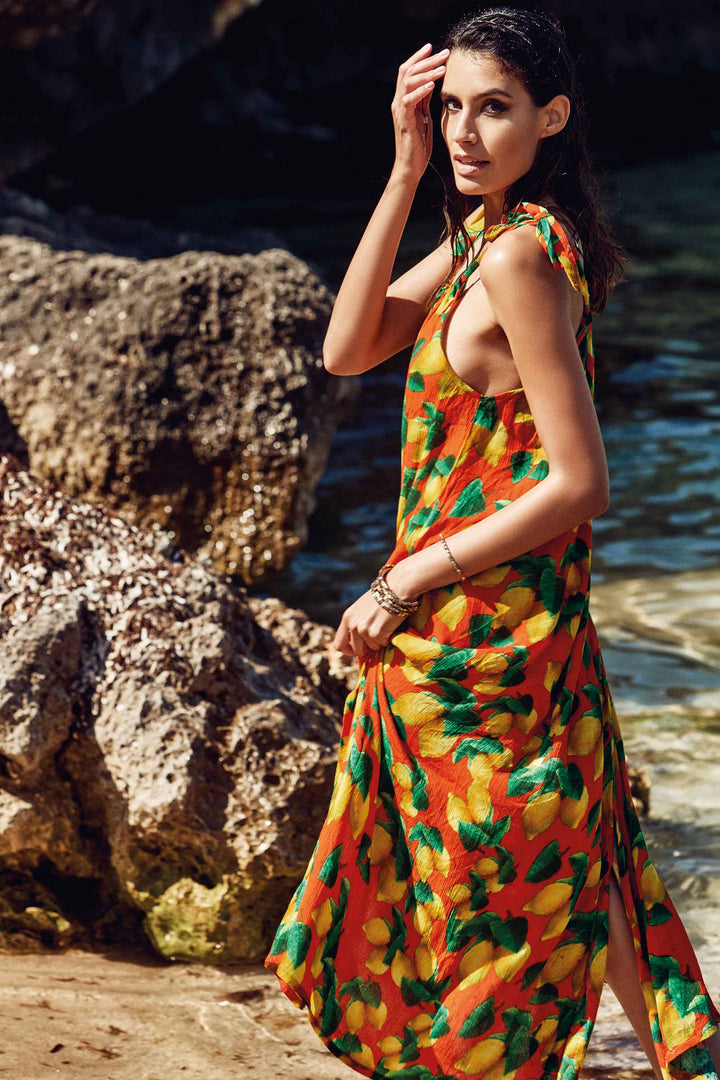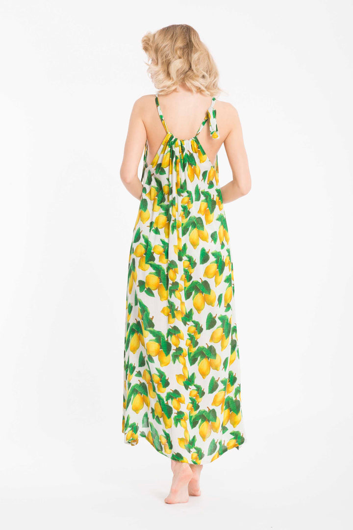 Abito lungo con spalline e scollo regolabili grazie alla coulisse, perfetto per un look estivo e rilassato. La fantasia limoni aggiunge un tocco vivace, mentre la vestibilità comoda garantisce comfort per tutta la giornata. Ideale per le calde giornate estive o per una passeggiata al mare.