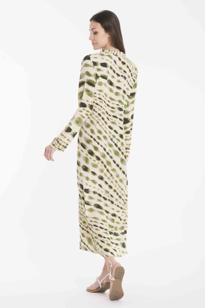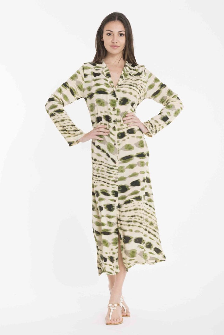 Abito lungo con collo camicia e maniche a 3/4 regolabili. L'abbottonatura anteriore aggiunge un tocco di eleganza, mentre il modello versatile si adatta a diverse occasioni. Perfetto per un look sofisticato e comodo.