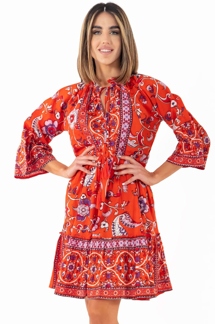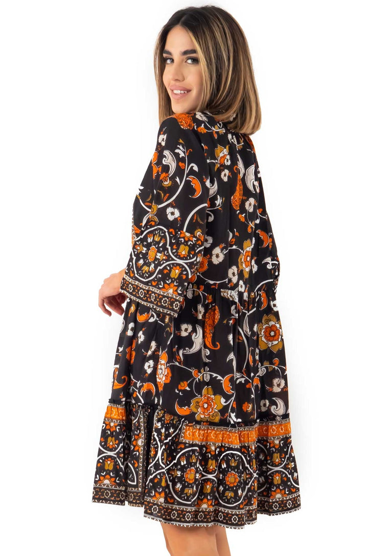 Un abito leggero con fantasia etnica e scollo regolabile con laccetti. Perfetto per l'estate grazie alle maniche a 3/4 con balza e la gonna a balze. Aggiungi un tocco di colore al tuo guardaroba con questo abito elegante e versatile.