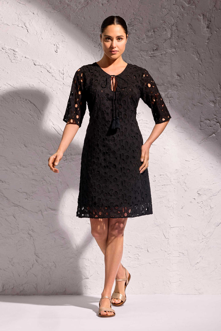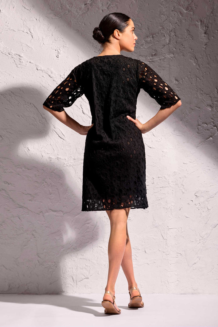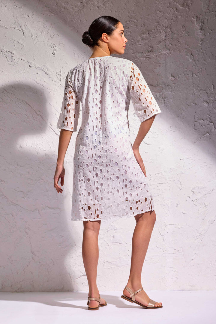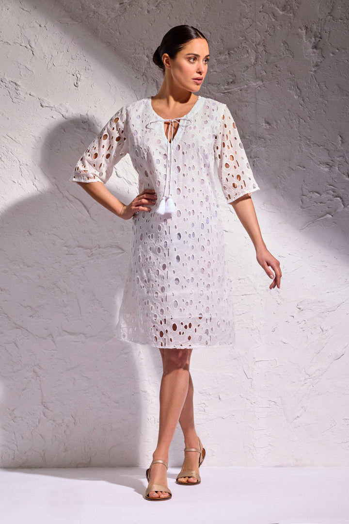 L'abito Mila è il capo perfetto per le tue giornate estive. Le maniche a 3/4 e lo scollo con laccetto lo rendono elegante e fresco, adatto a ogni occasione. Realizzato in pizzo Sangallo di puro cotone traspirante e foderato internamente per un comfort ottimale.