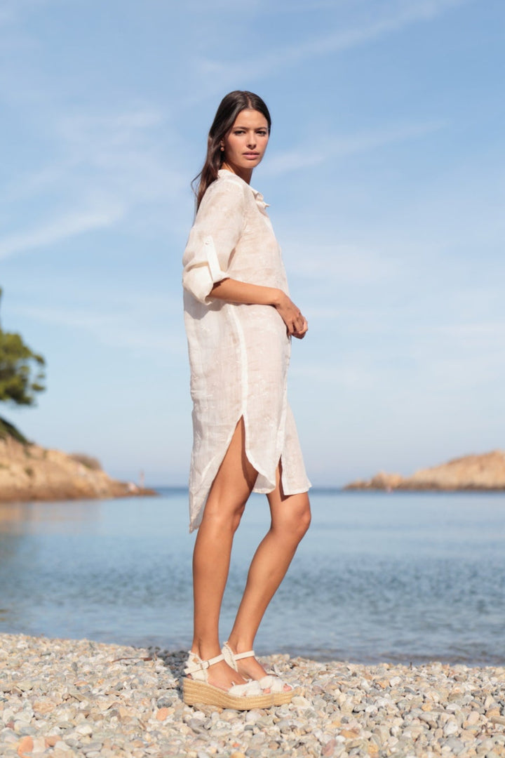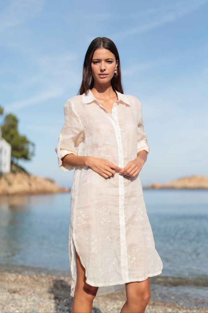 Questo abito camicia in tessuto vegetale sostenibile è realizzato con un tessuto pregiato che garantisce qualità e sostenibilità. Con i ricami tono su tono e il colore bianco, è la scelta perfetta per ogni occasione. L'abbottonatura sul davanti e gli spacchi laterali aggiungono un tocco di eleganza e versatilità.