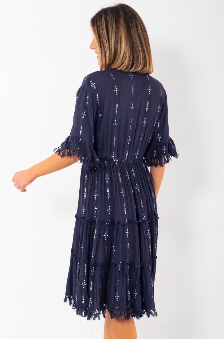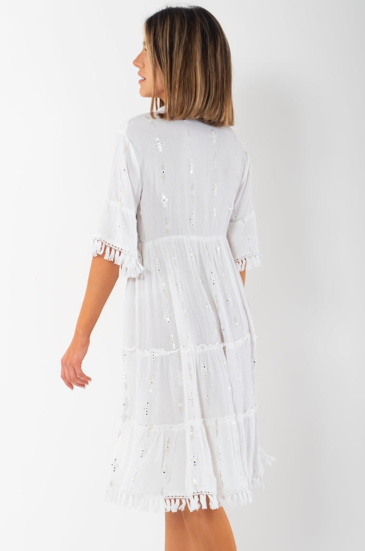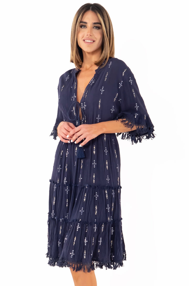 Questo abito intarsiato è perfetto per un look romantico e giocoso. Il tessuto intarsiato aggiunge un tocco di originalità, mentre il collo regolabile con laccetto e le maniche a 3/4 ti permettono di adattarlo al tuo stile personale. Con una lunghezza media e una gonna a balze, sarà il tocco di classe che cerchi.