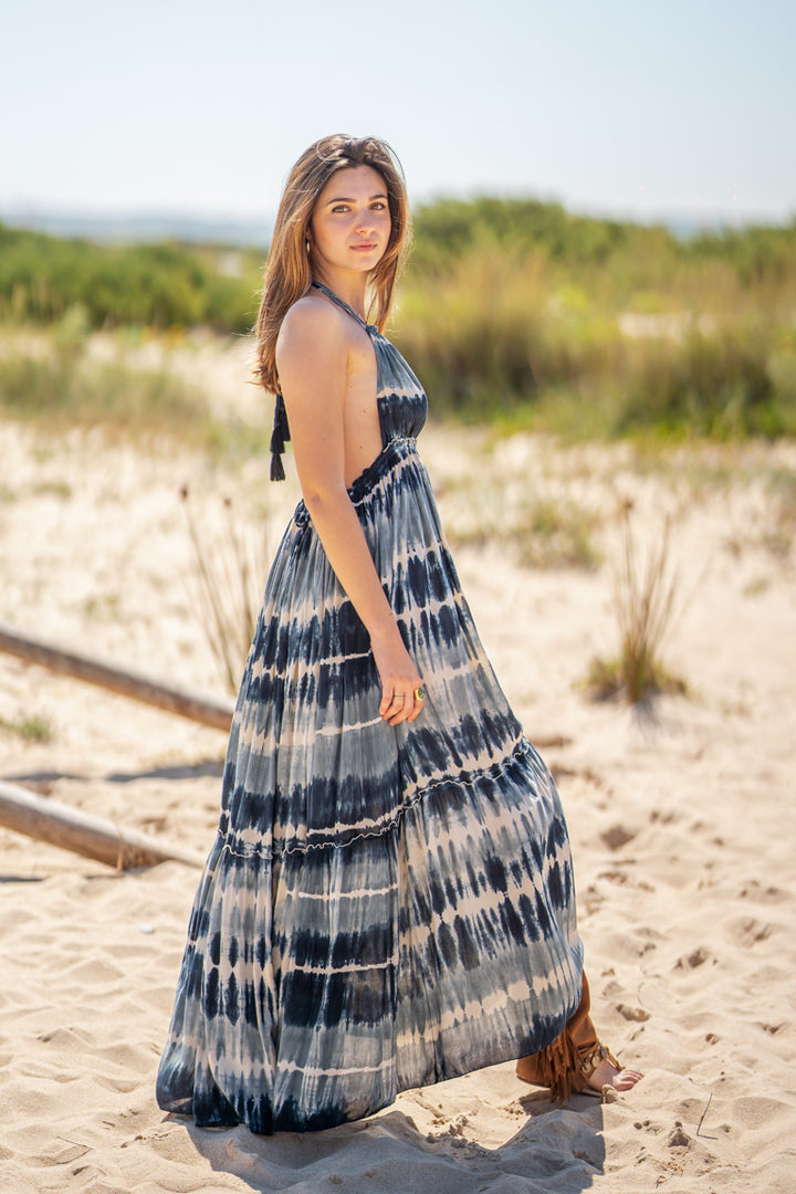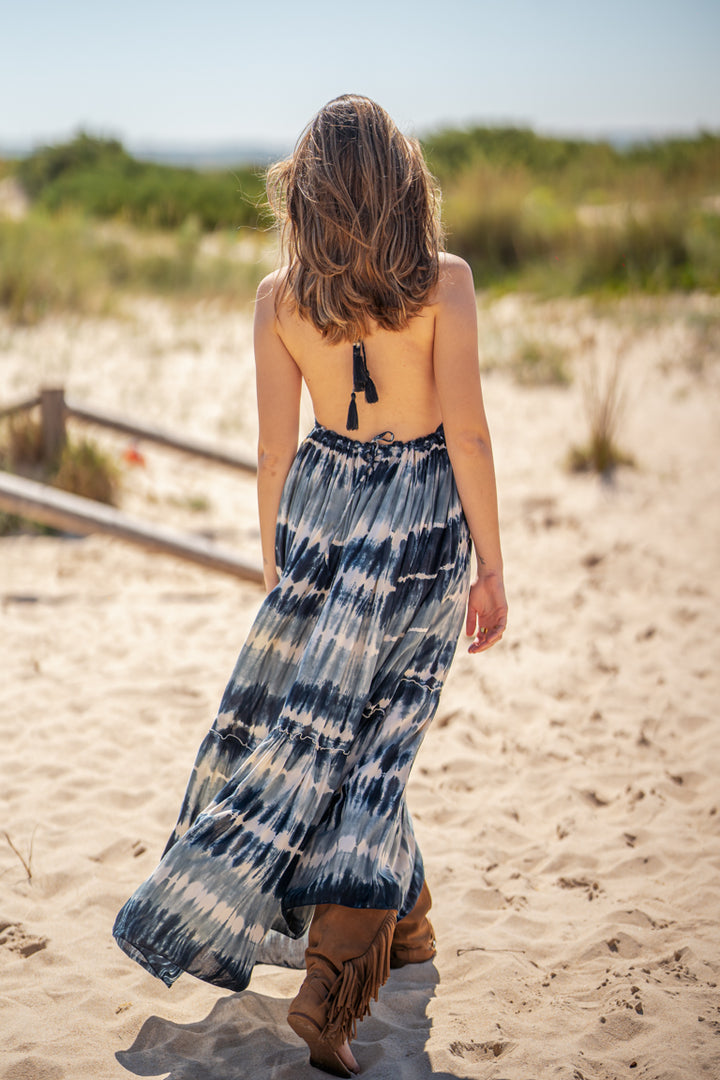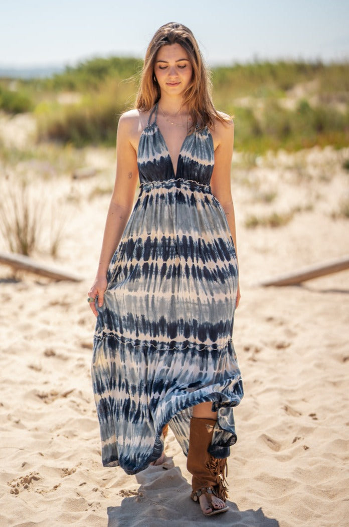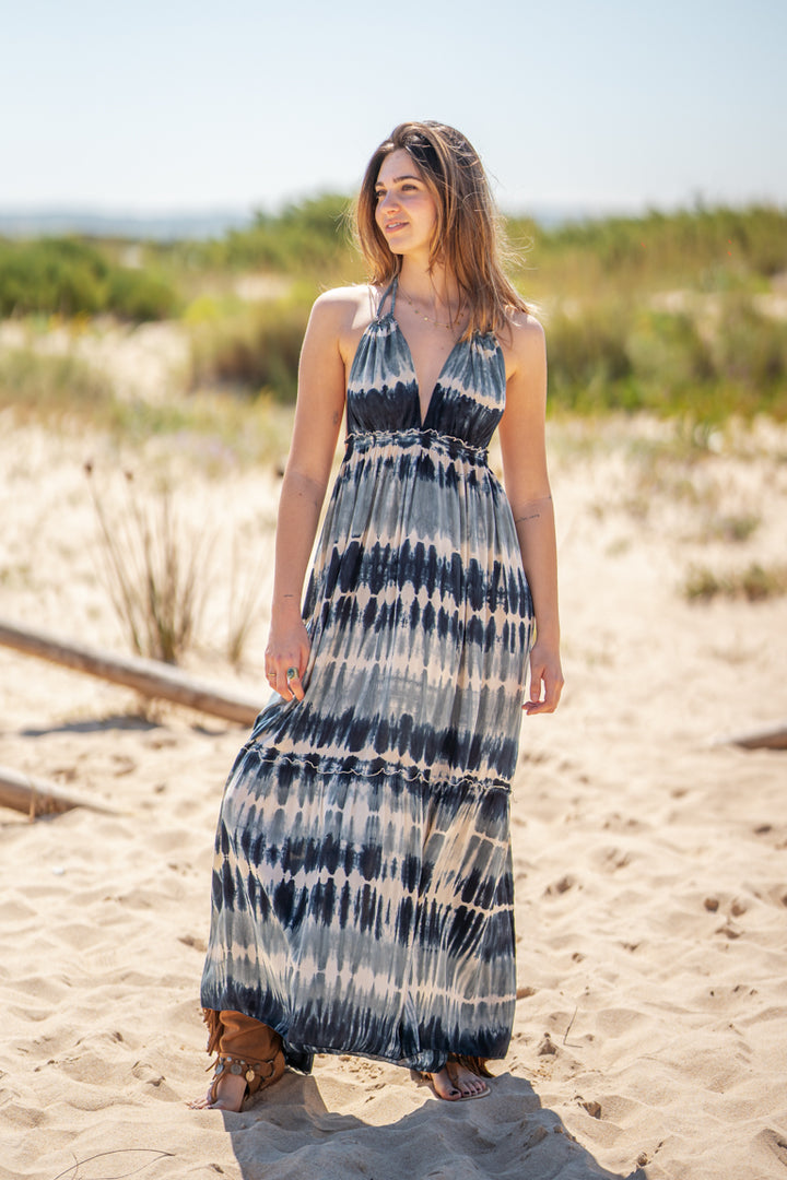 Questo elegante abito lungo Dafne è cucito a mano con una fantasia a righe tie dye, che lo rende unico. Il modello lungo è l'ideale per ogni occasione e il tessuto di alta qualità garantisce una vestibilità comoda e duratura. Prodotto a Bali per una vera esperienza artigianale.