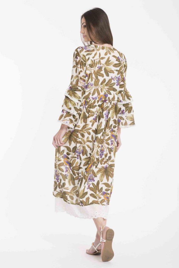 Abito lungo in puro cotone, con delicata fantasia floreale. Le maniche, arricchite da più balze e passamanerie, aggiungono un tocco di eleganza. Il fondo in pizzo Sangallo dona un raffinato dettaglio, rendendolo perfetto per occasioni speciali o per un look romantico e femminile.