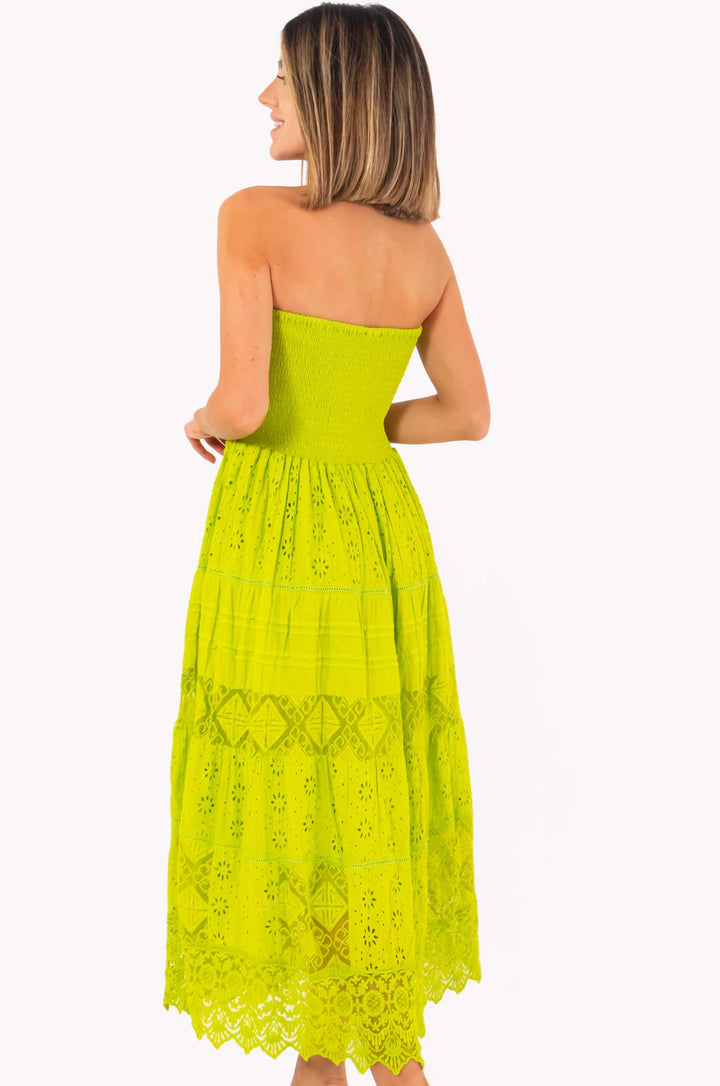 Esaltate la vostra femminilità con il nostro abito lungo in pregiato pizzo di cotone puro. Il modello arricciato a fascia sottolinea il busto, garantendo un look elegante e raffinato per ogni occasione.