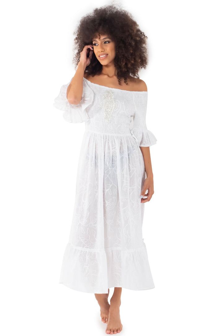 Aggiungi personalità al tuo stile con l'Abito Lungo Ricami! Il tessuto in puro cotone è interamente ricamato a mano, per un'effetto unico. Il modello lungo e il corpetto elastico con ricami in rilievo donano un tocco ultra-femminile. Le maniche corte con mini rouches e lo scollo a barca completano l'aspetto giocoso di questo abito.