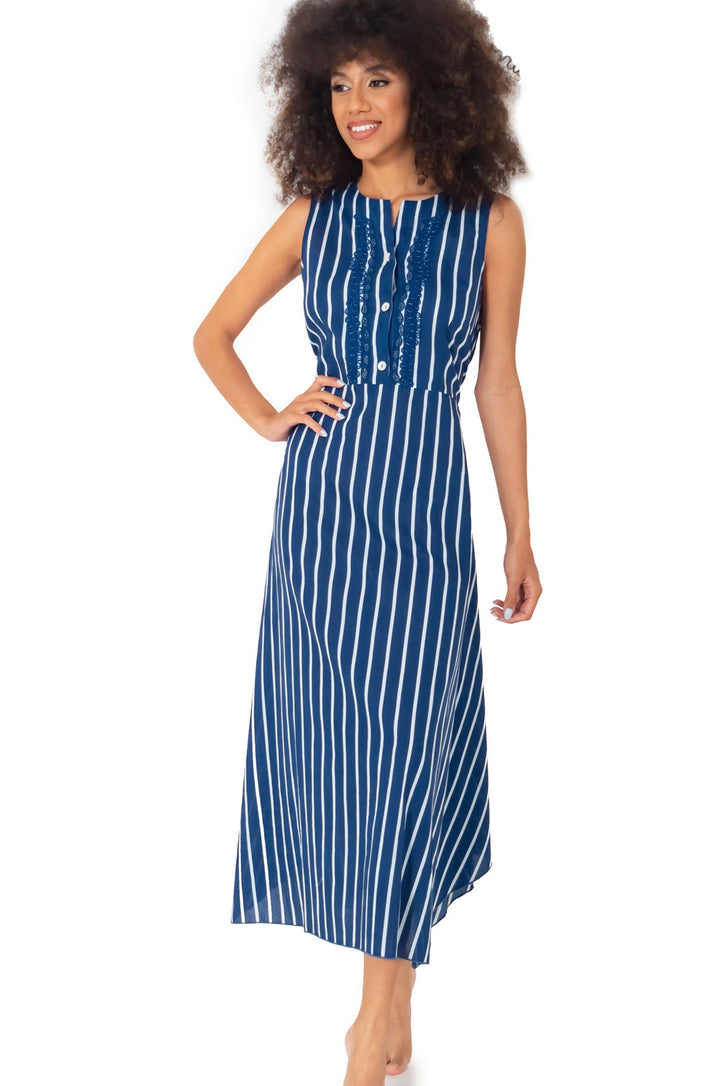 Realizzato in puro cotone, questo abito lungo con fantasia a righe è perfetto per esaltare la tua figura e allungare la silhouette. Il corpetto con bottoni cuciti a mano aggiunge un tocco di eleganza, mentre lo stile senza maniche lo rende perfetto per le serate estive. Non passerai inosservata grazie alle paillettes che donano un tocco di luce al tuo look.