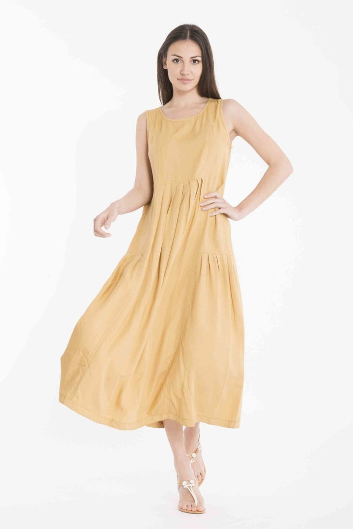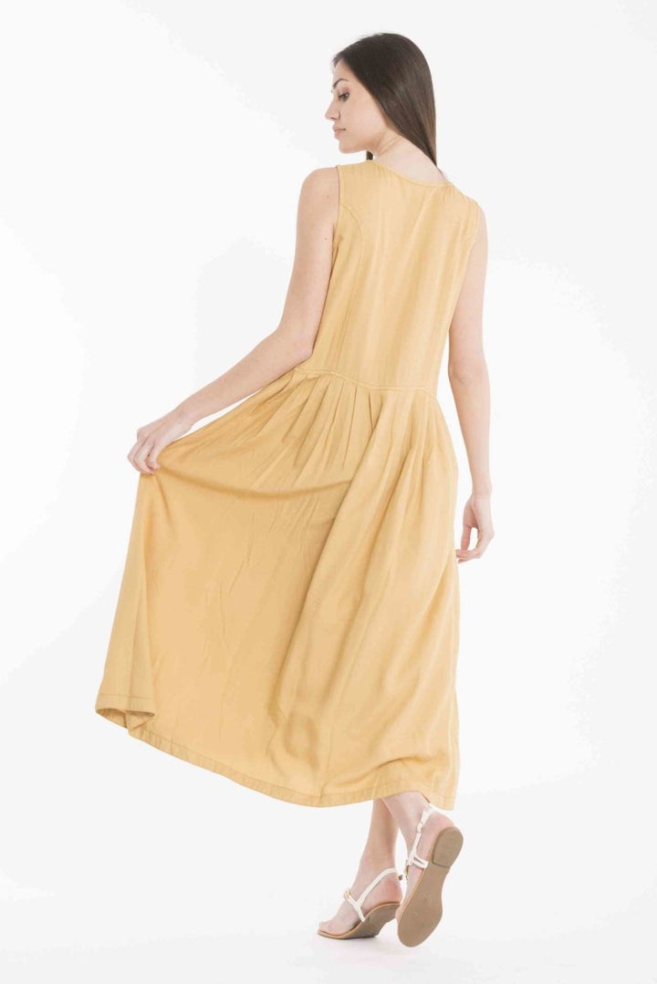 Abito lungo leggermente svasato, con scollo rotondo e vestibilità comoda. Le pratiche tasche laterali aggiungono un tocco di funzionalità, rendendolo ideale per un look casual e confortevole, senza rinunciare allo stile.