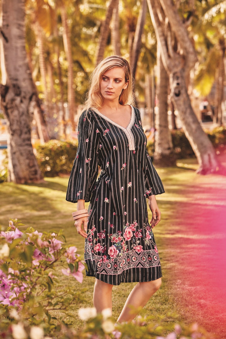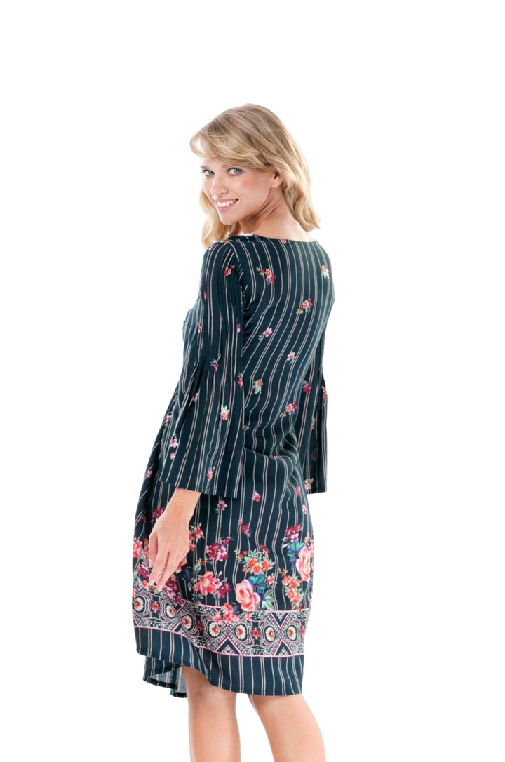 Vestito Michelle: scollatura a V con dettagli ricamati, maniche svasate e fondo ondulato. Fantasia maioliche, righe e fiori per uno stile unico e divertente.