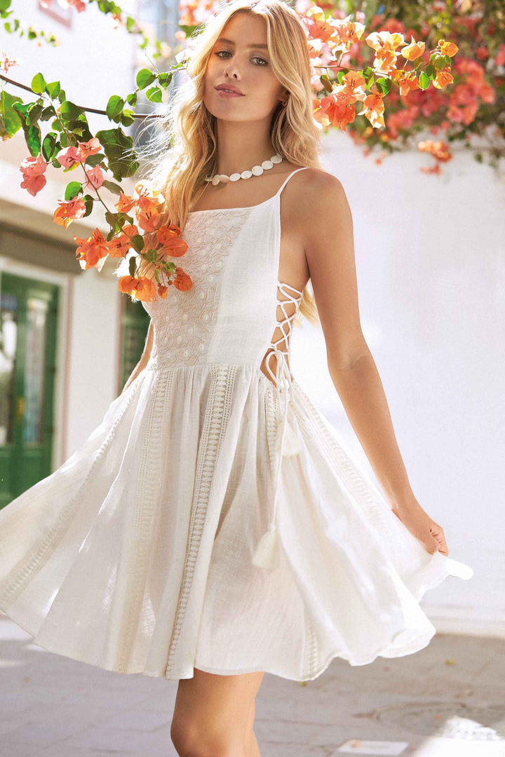 Aggiungi un tocco romantico al tuo look con questo abito in puro cotone. Con un delicato motivo ricamato a mano e inserti di merletti intarsiati, questo abito mini è perfetto per un look chic e romantico. E l'allacciatura dietro la schiena aggiunge un tocco di sensualità. (Semplicemente romantico!)