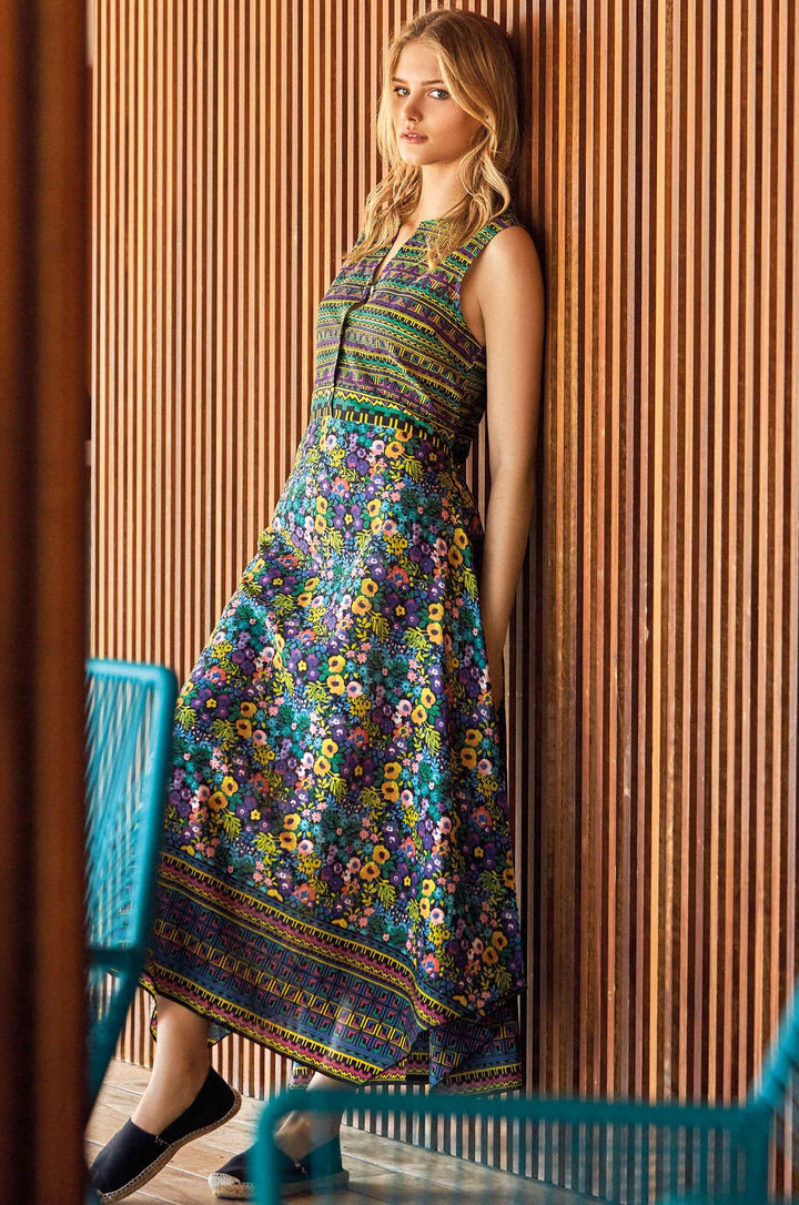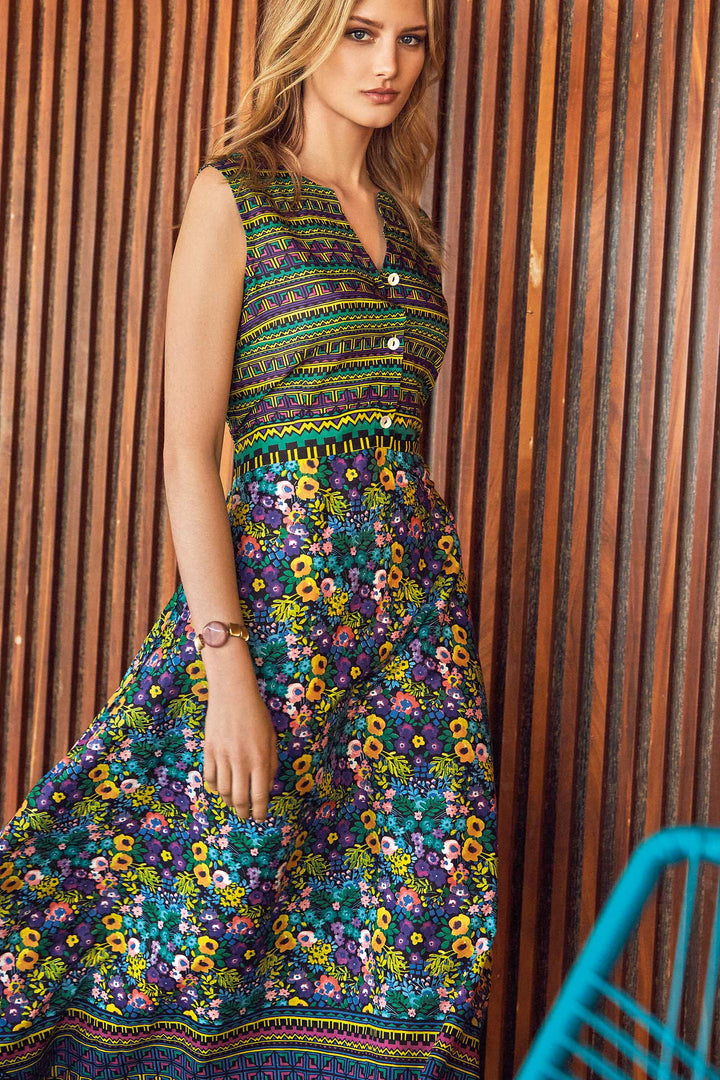 Questo abito smanicato è il capo perfetto per chi desidera un look elegante e femminile. Il modello lungo e la fantasia floreale e azteca lo rendono unico e originale. Inoltre, il corpetto con bottoni è studiato per valorizzare la vita e allungare la figura.