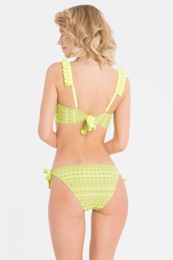 Bikini con spalline con volant removibili, arricchito da una vivace fantasia etnica. Il ferretto e le coppe removibili offrono un supporto personalizzabile, mentre lo slip con laccetti permette di regolare la vestibilità. Un modello versatile e stiloso, ideale per chi desidera un tocco di eleganza e comfort al mare.