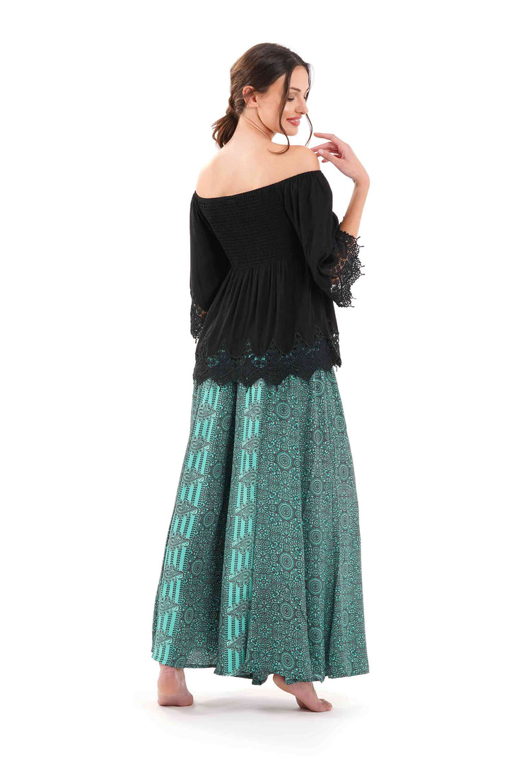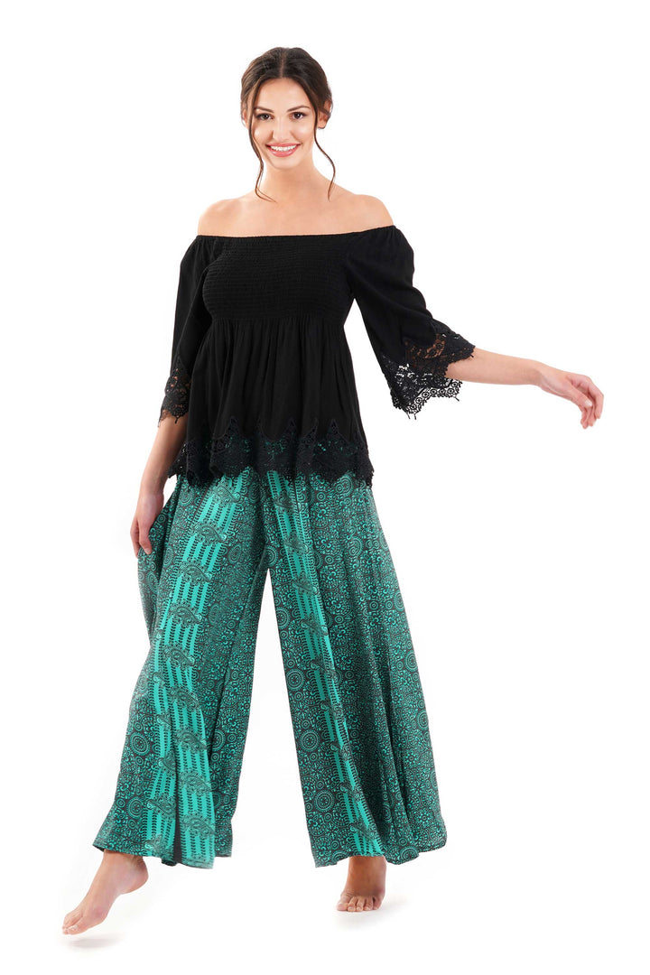 Questi pantaloni lunghi con gamba ampia e comoda sono caratterizzati da una raffinata fantasia etnica che cattura l'essenza dello stile bohemien. Il taglio generoso garantisce libertà di movimento, perfetto per chi ricerca un capo versatile che unisce comfort e personalità. Ideale per creare look sofisticati sia in contesti casual che più ricercati, questi pantaloni rappresentano un investimento di stile consapevole per il guardaroba contemporaneo.