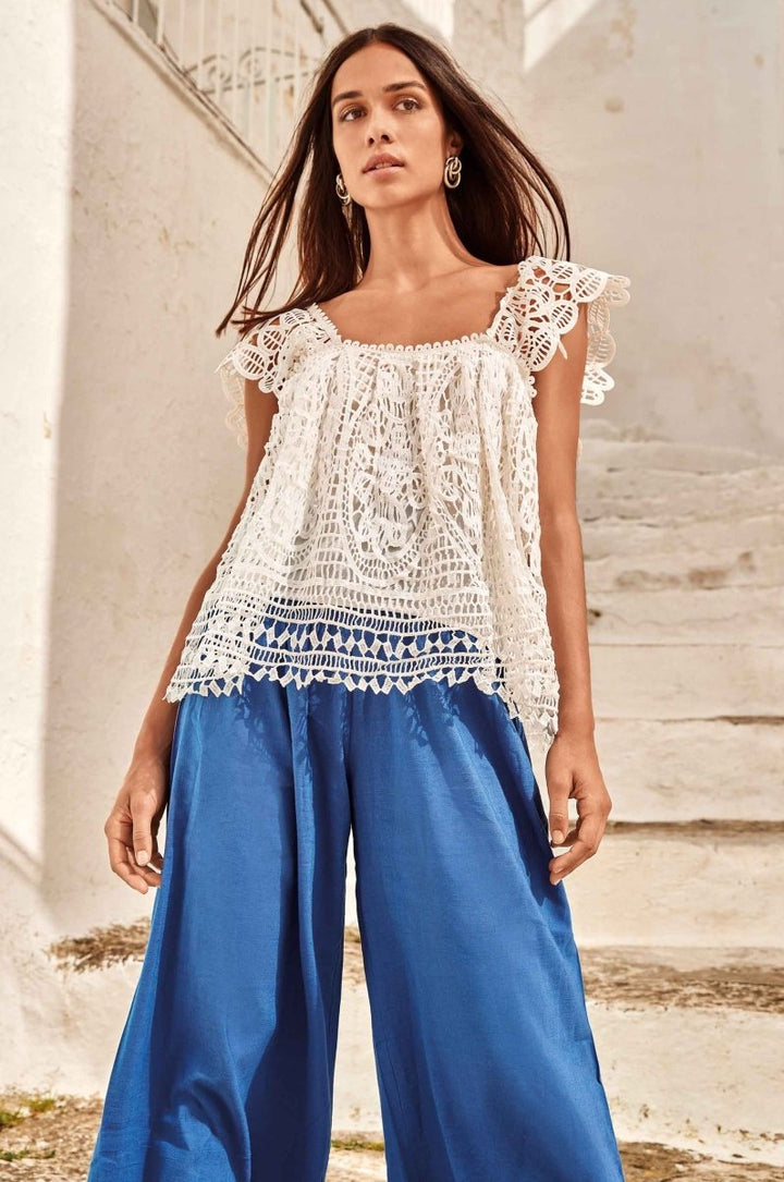 Top in tessuto di pizzo intarsiato, con scollo impreziosito da merletti delicati. Un capo elegante e raffinato che unisce la leggerezza del pizzo alla sensualità del design, perfetto per occasioni speciali o per aggiungere un tocco sofisticato al tuo outfit quotidiano.