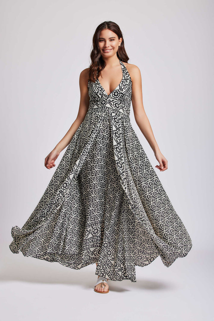 Explora um look elegante e sofisticado com o nosso vestido modelo longo Olimpia. Com um fecho ao pescoço e um decote em V profundo, este vestido oferece um toque de sensualidade ao teu estilo. O motivo em uma fantasia adiciona um toque de requinte a esta peça única e na moda.