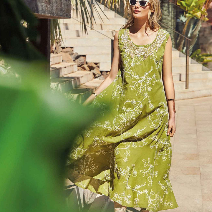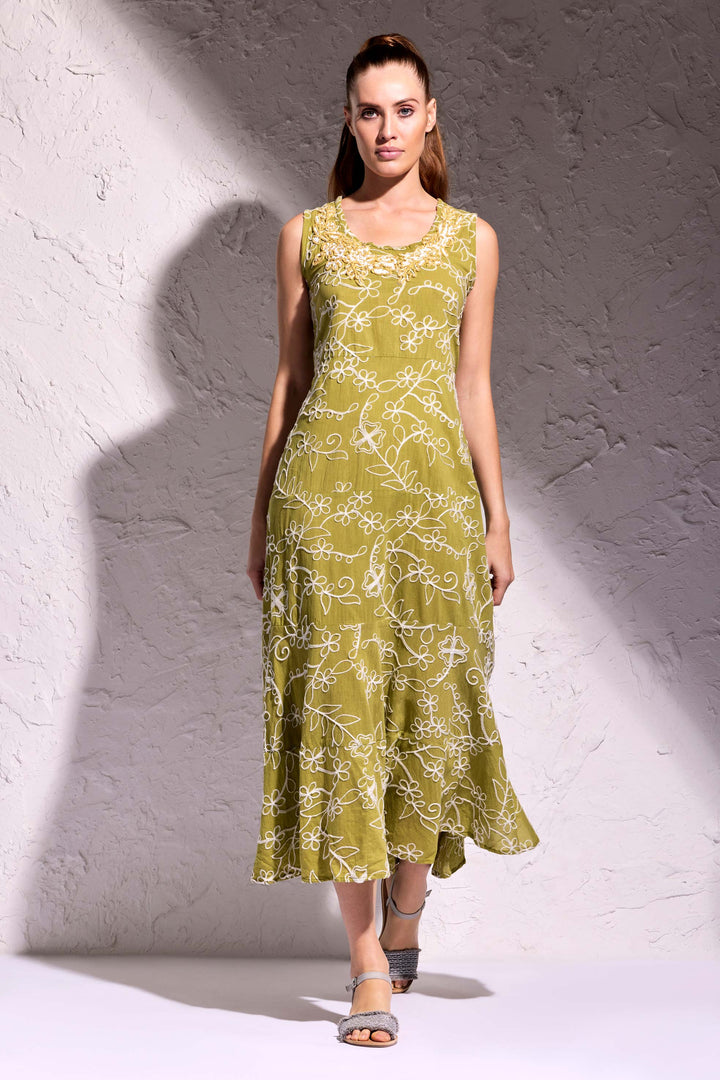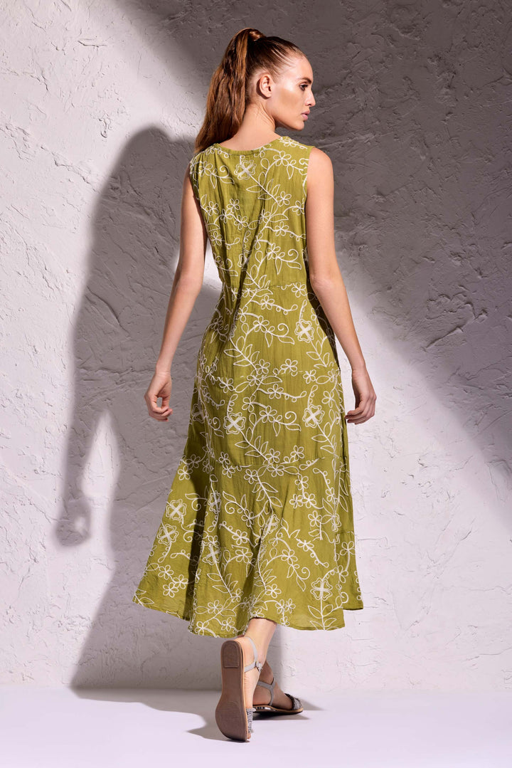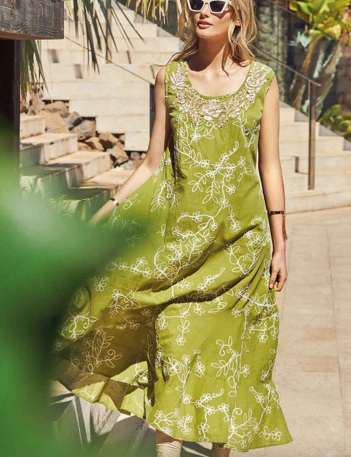 Este vestido longo é uma peça de alta qualidade, feita em algodão puro e enriquecida com elegantes aplicações. O modelo longo e a linha em A criam um visual sofisticado e feminino, enquanto os bordados artesanais feitos à mão com fio lurex adicionam um toque de brilho e elegância. Perfeito para uma ocasião especial ou para um look refinado do dia a dia.