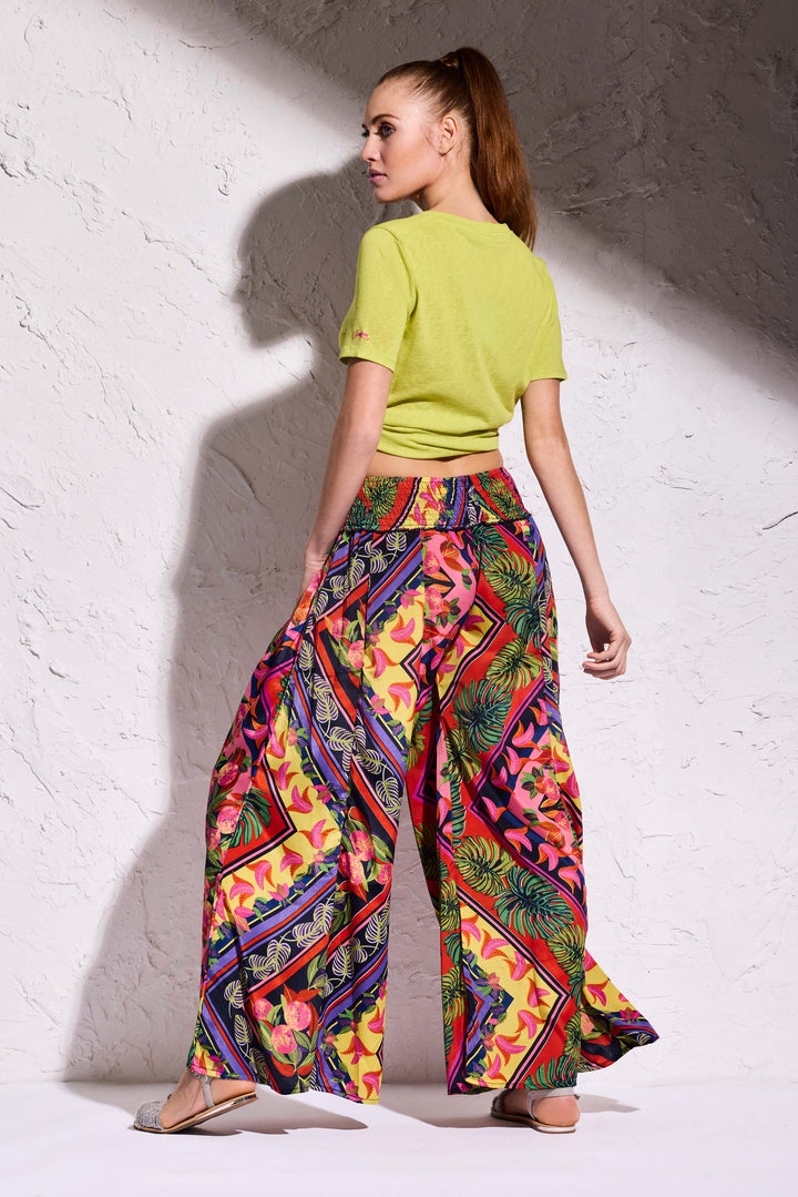 Calças palazzo confortáveis e frescas, caracterizadas por uma estampa pop de cores vivas. Perfeito para um look alegre e dinâmico, ideal para os dias de verão ou para um passeio informal.